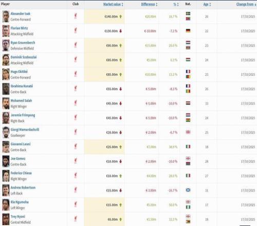 北京时间10月17日,德转市场更新了最新一期的英超球员身价。利物浦队中伊萨克身价上升2000万欧元,赫拉芬贝赫上升1500万,维尔茨下跌1000万欧元。