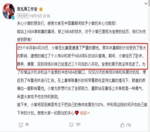 他个人的工作室也随之发出声明,表示小曾在4月末的比赛中受到了严重的腰伤,